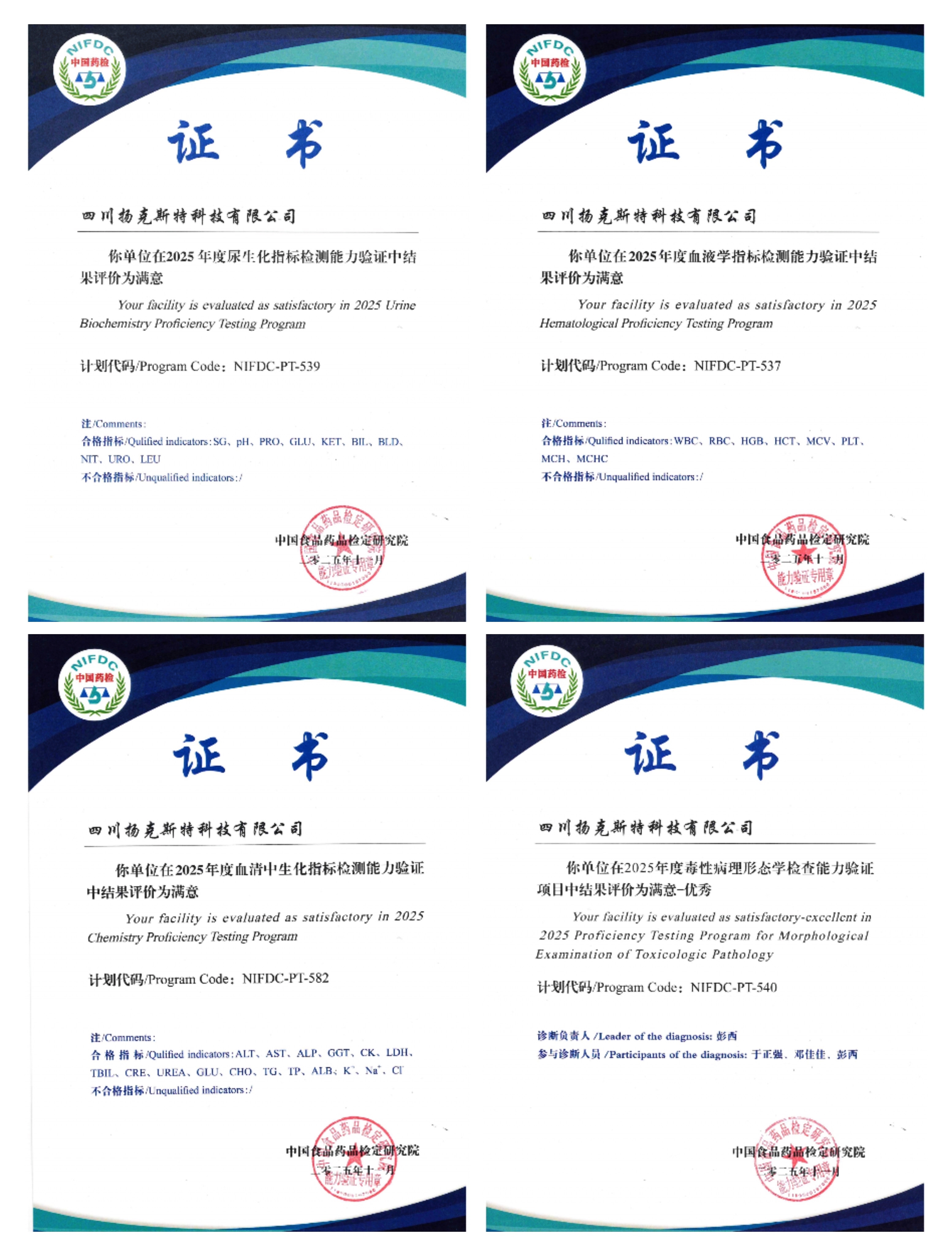 四川扬克斯特科技有限公司在2025年度中国食品药品检定研究院组织的能力验证活动中,